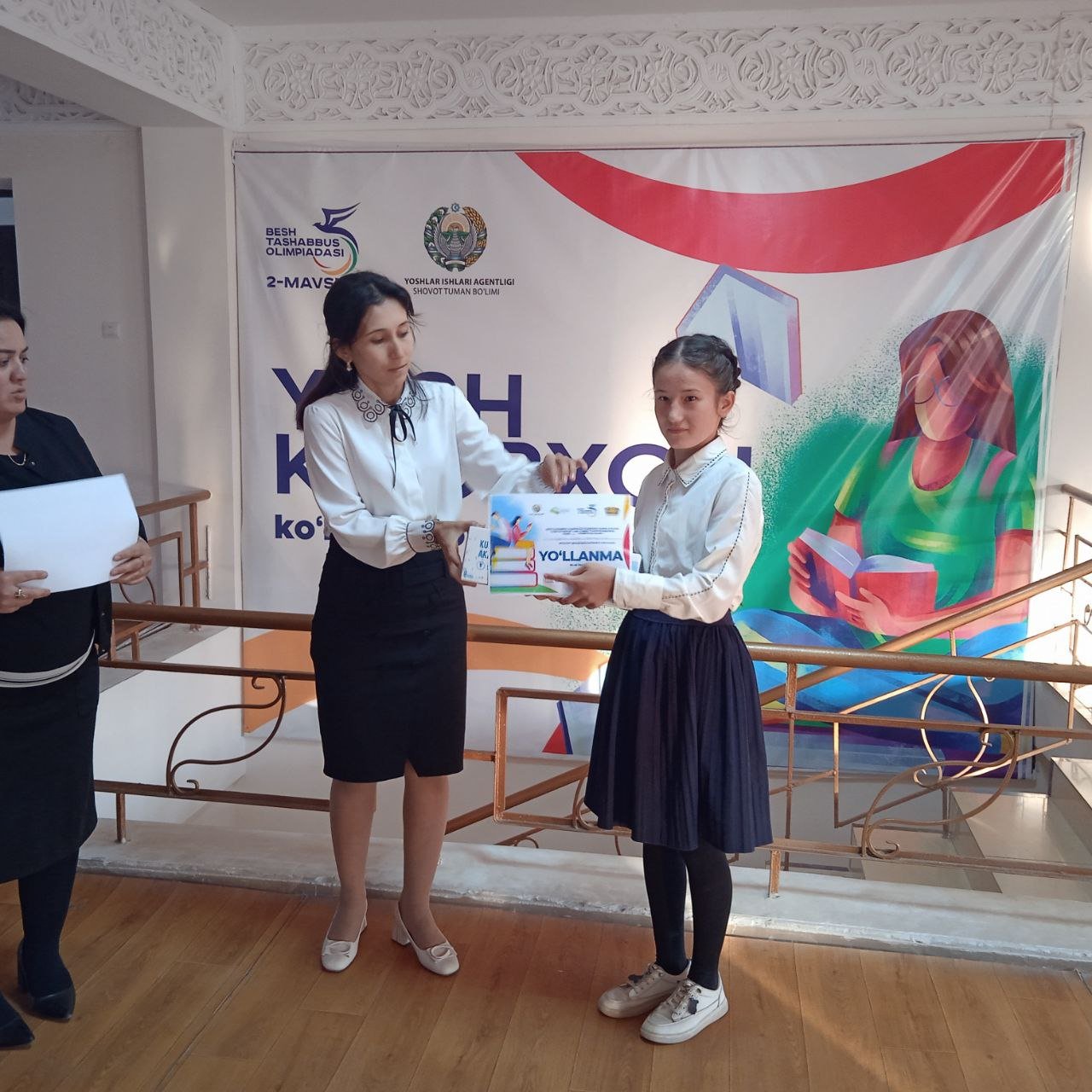 5 TASHABBUS olimpiadasi doirasida "Yosh kitobxon" tanlovining tuman bosqichlari 27-oktabr sanasida bo'lib o'tdi.Unda Shovot tumani 51-umumiy o'rta ta'lim maktabi 8-sinf o'quvchisi Sa'dullayeva Zilola faxirli birinchi o'rinni egallab viloyat bosqichiga yo'llanmani qo'lga kiritdi.
